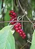 Schisandra chinensis, whose fruit is called magnolia berry[3] or five-flavor fruit (Chinese: 五味子; pinyin: wǔwèizǐ, in Korean: 오미자, romanized: omija),[4][1] is a vine plant native to forests of Northern China, the Russian Far East and Korea.[5] Wild varieties are also found in Japan.[6] It is hardy in USDA Zone 4. The fruits are red berries in dense clusters around 10 centimetres (3.9 in) long.