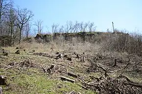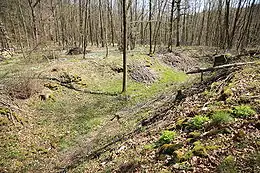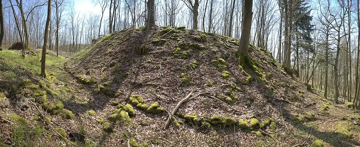 The east side, on the other hand, transitions almost on the level into the plateau, requiring a ditch to be built there. This section of dry moat was about 35 metres long and 13.5 metres wide. Its outer edge facing the plateau is 1.9 to 2.3 metres above the bottom of the ditch, its inner is considerably higher, about 2.7 to 3.8 metres above the bottom. The ditch, for which no spoil heap can be identified, runs in a shallow arc around the outer ward and ends on both sides at the edge of the plateau, the ends being slightly refused. In the northern part of the moat a 1.5-metre-long section of dry stone wall has survived.