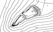 The plan of the main castle was in the shape of an elongated triangle with a length of about 50 metres. It was 20 metres wide at the base, but only 7 metres wide at the tip. Along the whole of the north side, the hillside drops vertically for a few metres; the southern side has a vertical rocky drop only near the tip of the spur.