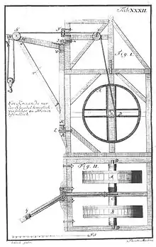 A new harbour crane installed in 1684 is attributed to Jacob Leupold.[1] This crane could also rotate but two large treadwheels enabled six men to lift a load of three tonnes. In his book on the theory of machines, Leupold illustrates two cranes at Bremen. The more ambitious model is pictured here. The boom would have been much longer as it has been shortened to fit within the illustration. The crane would have been used for moving exceptionally heavy loads of single items as the predominant method of moving loads was to use human labour.