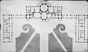 In the outskirts of Bonn, the capital of the Cologne Electorate, the ‘Kottenforst’ forest was a centre of such ‘par force’ hunts.[1] As from 1727, wide avenues were created.[1] And in the centre of these star shape radiated avenues, a hunting lodge was constructed between 1753 and 1761, Schloss Herzogsfreude.[1] The architect was Johann Heinrich Roth (1729-1788).[1]