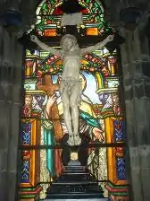 The hall of Beletage links to the chapel, which is a building on its own. The wallpaintings are by Karl Julius Grätz. The glass paintings are by Binsfeld and Janssen. Peter Fuchs created the saint statues. The mosaic floor with his figural representations was designed by the architect and produced in Mettlach.