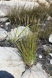 Southern African Schoenus were once classified as Tetraria; however, based on molecular and morphological differences, we now know that the two groups are evolutionary distinct.[7] To ensure that this group of sedges is monophyletic (i.e. the genus only has closely related species), several species of Epischoenus and the southern African Tetraria were transferred into Schoenus.[7] In the field, the southern African Schoenus can be distinguished from Tetraria species by their lack of stem leaves and the absence of reticulate sheaths at the bases of the flowering stems.[7]