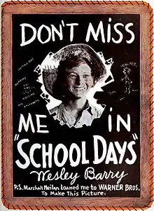 School Days is a 1921 American comedy film directed by William Nigh, written by Walter DeLeon, Hoey Lawlor and William Nigh, and starring Wesley Barry, George Lessey, Nellie Parker Spaulding, Margaret Seddon, Arline Blackburn, and J.H. Gilmour. It was released by Warner Bros. on December 25, 1921[3][4][5] and was Warner's biggest grossing film until The Sea Beast in 1926.[1]