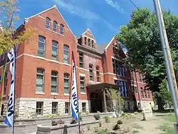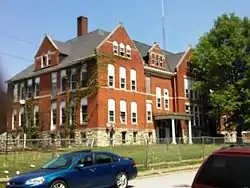 School Number 6 actually began as School Number 11 and located on Locust Street, just west of the Chicago, Rock Island and Pacific Railroad crossing.[3] It was replaced in 1858 by a two-room, frame school building at the present location. In 1874, the lot to the east of the school was purchased for a playground from the neighboring Presbyterian Church. The school was located in the Hamburg neighborhood, a large German neighborhood whose lower portion has been designated a historic district. As the area population increased, the Davenport Community School District determined it needed to provide a larger building. This was during the superintendency of J.B. Young when eight new grammar schools and a high school were built and six older buildings were extensively remodeled. Prominent Davenport architect Frederick G. Clausen was chosen to design the new School Number 6. Local contractors Oelerish and Peters were responsible for construction, which cost $19,400.[3]