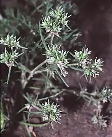 Scleranthus annuus is an annual or biennial herb with low, much-branched spreading stems up to 15 cm (6 in) long growing from a taproot. The leaves are needle-like or linear in shape with sharp, stiff points. They are oppositely arranged in pairs about the stem and are fused together at the bases. Flowers occur in pairs or small clusters of up to five. The flowers lack petals but have bell-shaped calyces of green petal-shaped sepals.[1][2]