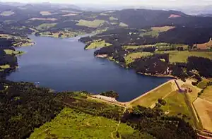 Aerial view of Henry Hagg Lake and Scoggins Dam