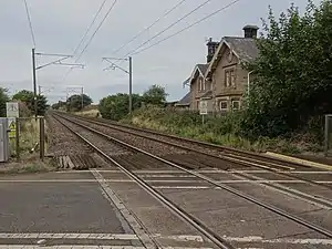 The station opened on 29 March 1847 by the York, Newcastle and Berwick Railway. The station was situated at a level crossing of an unnamed minor road a mile east from Scremerston village. This was one of the original Newcastle and Berwick stations and it was designed by the Newcastle architect Benjamin Green. South of the level crossing was a siding that served a lime depot. The passenger traffic at most of the main line stations in the north of Northumberland was so light that the LNER closed most of them; Scremerston was one of them, closing on 5 May 1941. The station later reopened on 7 October 1946, although Sunday services were stopped. In 1950, a memorandum was made that showed that closure would yield an annual net economy of £559 so it was recommended that the station should close to all traffic. The station closed to passengers again on 8 July 1951 and closed completely the day after,[1] although an unadvertised service ran in 1953. The platforms were demolished in 1959. The lime depot still exists and the station house is in residential use.[2]