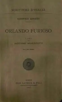 The Scrittori d'Italia ("Authors of Italy") was an Italian book collection, published by Giuseppe Laterza & figli from 1910 to 1987 in Bari.[1] The series was born with the intent to define and explain a cultural canon of the new Italy, disassociating from a culture yet considered too much based on the classic of the humanism, and choosing to represent also the civil history of the newborn Italian State. The original work plan included 660 volumes, of which 287 were actually published (including some second editions) for a total of 179 works.[1]