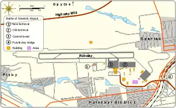The placement of main buildings on the airport made its defense by Ukrainian forces more difficult from the start, because the airport structures are located on the south section, while the runway which served to resupply Ukrainian forces was in the open, thus allowing DPR fighters to easily target them.