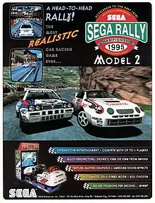 Sega Rally Championship is a 1994 racing game developed by Sega AM3 and published by Sega.[5] Originally released for arcades using the Sega Model 2 board, ports were published for the Sega Saturn in 1995 and Microsoft Windows in 1997. Sega Rally Championship simulates driving on different surfaces, with different friction properties, with the car's handling changing accordingly. As the first racing game to incorporate this feature, Sega Rally Championship is considered to be one of the milestones in the evolution of the racing game genre.[6] It was also an early rally racing game and featured cooperative gameplay alongside the usual competitive multiplayer.