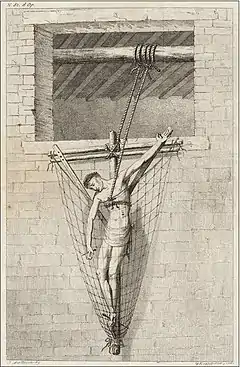 Mattio Lovat hanging from a window during his self-crucifixion attempt