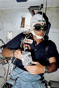 Norman Thagard self-experimenting aboard the Space Shuttle. He conducted physiological experiments on personnel during the STS-7 mission.