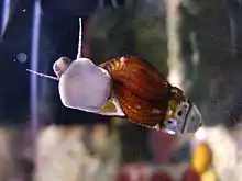 | A live individual of Semisulcospira kurodai crawling on the glass of an aquarium | |