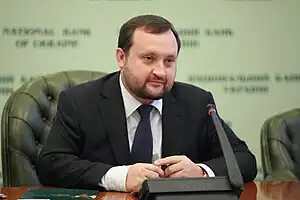 In 2010 Arbuzov was appointed chairman of the Supervising Council of UkrEximBank, and in September 2010, he became a deputy chairman of the National Bank of Ukraine.[7] On 21 December 2010, the President of Ukraine sent a petition to the parliament to replace Volodymyr Stelmakh with Arbuzov. On 23 December 2010 the Verkhovna Rada approved the petition, making Arbuzov the youngest chairman of a state central bank. After the appointment, the older son of the President, Oleksandr Yanukovych, bought the All-Ukrainian Bank of Development from Arbuzov. The bank's chairperson is Arbuzov's mother, Valentyna, who also has extensive experience in the banking business.