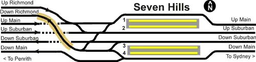 Seven Hills railway station is located on the Main Western line, serving the Sydney suburbs of Kings Langley, Lalor Park, Seven Hills and Seven Hills West.[2] It is served by Sydney Trains T1 Western and T5 Cumberland line services.