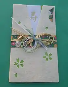 A shūgi-bukuro (祝儀袋, lit.'celebratory gift bag') is a special envelope in which money is given as a gift of celebration in Japan, especially at weddings or other auspicious occasions, such as a birth or celebrating a new home.[1][lower-alpha 1] The giver inserts the money into a shūgi-bukuro on which they have written their name, and the amount of money inside. In the case of weddings, the shūgi-bukuro is handed to the receptionist of the reception party; otherwise, the money is collected by the person themselves, with the envelopes acting as a record of who gave money and how much they gave.[1] Shūgi-bukuro are sold at supermarkets and stationery stores.
