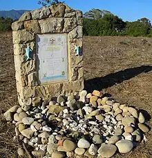 A marker monument was built on the small remaining parcel near the southern (beach) approach to Shalawa Meadow with colorful inlaid ceramic tiles adorned with lizards, birds, flowers, and two bas-relief dolphins in turquoise ceramic along with this inscription: