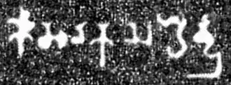 All the inscriptions written in the so-called "box-headed" script. The tops of the characters appear to be small square-shaped boxes, resulting in this nomenclature.[30] These characters are similar to the ones occurring in the Vakataka records. However, the Vakataka characters are less stylised, and therefore, can be assigned to an earlier period. It is not certain if the Sharabhapuriya characters are a result of the Vakataka influence.[31]