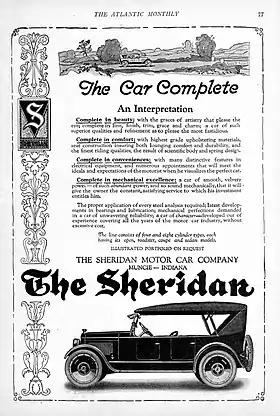 The Sheridan was a brand of American automobile manufactured from 1920 to 1921. Manufacture of the car was based in Muncie, Indiana.[1][2] The Sheridan nameplate has the distinction of being the first automotive brand started from scratch by General Motors. Prior to the Sheridan, General Motors, under William (Billy) Durant, grew its automotive marques Chevrolet, Oakland, Oldsmobile, Buick and Cadillac, by acquiring independent manufacturers and then folding their operations into the GM structure.[3]