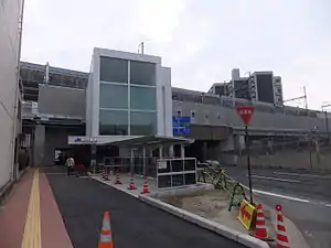 The station was built to allow a direct connection between the Astram Line and the Sanyo Main Line. Initial plans were to have a circular shell cover the entire passageway connecting the Astram Line and JR West stations. The contract for design was awarded to C+A Coelacanth and Associates in 2012, with a planned opening sometime in 2014. However, structural concerns caused the opening to be delayed by one year, and caused the circular shell to be cut back so it no longer covered the passageway. The station opened on 14 March 2015.[2] A green roof was later installed in the passageway sometime during 2015.