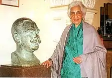 The Rajmata standing next to a bust of her famous father Maharaja Ganga Singh