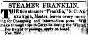 Fenix was sold and again renamed, as Franklin and was run by the Citizens' Accommodation Line in company with Canemah. Three times a week Franklin made trips from Canemah to Salem, stopping at the many landings along the way.[5] In February 1855, Franklin was advertised as making daily trips to Champoeg, Oregon and intermediate points, and would make through trips to Corvallis during the winter.[6] Franklin was then running under the command of S.C. Alexander.[6]