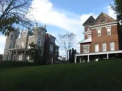 Fifteen houses compose the district, which is located on the sides and top of a small hill.[2] Twelve of the fifteen are located along Walnut Avenue, and the other three line North Street; they were built in such styles as Queen Anne, Greek Revival, and Italianate. Common construction materials include stone foundations, brick walls, and slate roofs. Although the oldest property in the district dates back to 1847, and the newest to 1913,[3] the majority of the district's houses were built in the last years of the nineteenth century, and most houses in the neighborhood that are significantly older were extensively modified at that time. During the late nineteenth century, Sidney was passing through a period of transformation: since its establishment in 1820, its identity was that of a small county seat in an agricultural region, but by the end of the century, institutions such as the People's Federal Savings and Loan Association were causing it to gain prominence in commerce, industry, and banking. Leading members of the city's society, such as factory owners, bankers, and businessmen built large homes on the hillside along Walnut Avenue, and it became known as the city's élite residential neighborhood.[2] Among its most important residents were jeweller Edward Kah,[4]: 520 merchant Elias Griffis,[4]: 665 garden company owner Bernard Wagner,[4]: 756 and educator Herbert McVay.[4]: 824