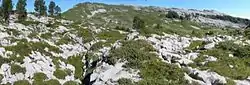 ![]() Lapiaz (eroded calcareous rock) still partially covered by vegetation on the Sieben Hengste massif. | |