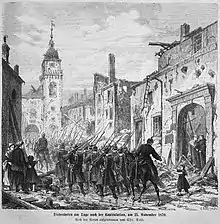 The siege of Thionville was a battle of the Franco-Prussian War which occurred in Thionville of the Moselle from November 13 to November 24, 1870. The small French garrison repulsed an attempted attack on August 14.[7] It was subjected to a blockade and then besieged from November 13. After the capitulation of Metz, on October 28, 1870, the Prussians move part of their powerful artillery to Thionville. Bombed from November 22, the square surrendered on November 24. The capture of Thionville and that of Montmédy a month later gave the Germans control of the railroad to the Picardy front.[8]