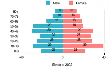 According to the 2002 Poland census, there were 400 people residing in Sielec village, of whom 47.5% were male and 52.5% were female. In the village, the population was spread out, with 25% under the age of 18, 34% from 18 to 44, 23% from 45 to 64, and 18% who were 65 years of age or older.[1]