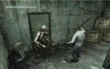 In the main levels of the game the player uses the usual third-person view of the Silent Hill series.[2] The player has a limited item inventory which can be managed by leaving unneeded items in a chest in Henry's room.[3] Silent Hill 4 emphasizes combat during gameplay, with a near-absence of complex puzzles in favor of simple item-seeking tasks.[2] Unlike previous games in the series, separate difficulty settings for combat and puzzles are not available; changing the combat difficulty also affects the difficulty of puzzles.[5] In the second half of the game Henry is accompanied and helped in combat by his neighbor Eileen Galvin. Eileen cannot die while she is with Henry, although as she takes damage she succumbs to possession,[6] which also occurs if she is given a firearm. The damage Eileen takes in the game determines whether or not she dies during the final boss fight, directly affecting the ending achieved.[4][7]