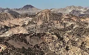 North aspect of Silver Peak centered in the distance, seen from Mammoth Mountain. Sharktooth Peak to immediate right.