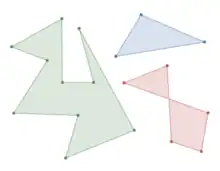 Two simple polygons (green and blue) and a self-intersecting polygon (red, in the lower right, not simple)