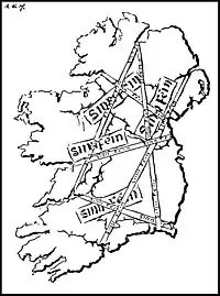 "Irish names were attached to goods that never saw Ireland until they were brought into the country ready for sale. The Sinn Feiners discovered the fraud, and countered by the establishment of the Irish trademark. A sign peculiar to Ireland was agreed upon, namely a scroll device representing the legendary Collar of Malachi, surrounded by the words, Deantha i nEirinn [sic.] (Made in Ireland). The use of this sign was permitted to manufacturers who could show that their goods were made in the country, and every infringement was prosecuted under the British Trades Mark Law, the Irish people being for once able to use British law to their own advantage."[3]