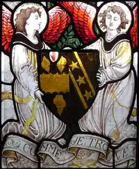 Arms of Rev. Sir Frederic Shelley, 8th Baronet (1809–1869): Sable, a fesse engrailed between three whelk shells or with inescutcheon of the Red Hand of Ulster, impaling the arms of his wife Charlotte Martha Hippisley (1812–1893): Sable, three mullets pierced in bend between two bendlets or, with on a scroll below motto of Shelley: Comme je trouve ("As I find"). Detail from memorial stained glass window in north wall of north aisle of Shobrooke Church, Devon