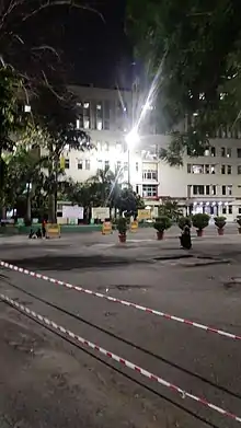 Sir Ganga Ram Hospital's front block at night