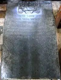 His ledger stone survives, set into the floor of the nave of St Mary's Church, Poltimore, inscribed as follows: