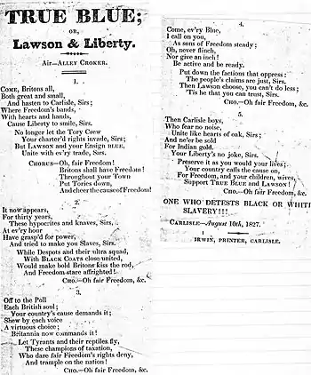 An incident occurred in 1837, which demonstrates Lawson's independent character. It happened after Graham infuriated his constituents by accepting a position in the Tory government.[21] At the ensuing election, his former supporters nominating rival candidates then flocked into the constituency to show their contempt. Cavalcades of horsemen, sporting banners and flags, many of whom had ridden many miles, stood in a line, four abreast, stretching over half a mile in length. One flag bore a black gamecock, with yellow legs and comb, and a large white feather in its tail. It carried a motto, 'The Renegade Cock of the North', in reference to Graham's sobriquet. Another carried a yellow flag at half-mast, bearing a portrait of Graham lying on his back, with the slogan, 'Sir James Crow, jump about, wheel about, and fall just so'. While a coat turned inside out with yellow sleeves hung from the top of one Flagstaff. Lawson sat at the head of the concourse and was the first to defy his brother-in-law, resulting in Graham's only defeat in that city. It was also said that Lawson's neighbours and fellow landowners, who in private remained on intimate terms, would, when they met in the streets of Carlisle, walk out of their way rather than be seen discussing issues with a man of such character.[22]
