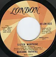 "Sister Morphine" is a song written by Marianne Faithfull, Mick Jagger and Keith Richards. Faithfull released the original version of the song as the B-side to her Decca Records single "Something Better" on 21 February 1969.[1] A different version was released two years later by the Rolling Stones for their 1971 album Sticky Fingers.[2] Jagger produced the track.
