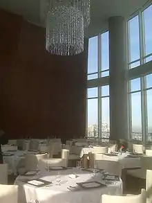 Sixteen had been described architecturally as a sequence of spaces that do not reveal themselves at once, but rather in "procession".[6] The restaurant's foyer is T-shaped, and a passageway to the hotel is lined with floor-to-ceiling architectural bronze wine racks in opposing red and white wine rooms.[4][7][8] The passageway leads to views—praised by Chicago Tribune Pulitzer Prize-winning architecture critic Blair Kamin—that showcase the Wrigley Building clock tower and the Tribune Tower's flying buttresses. Kamin regarded these views to be "more intimate" than the panoramic ones of the Signature Room, a restaurant near the top of the 100-story John Hancock Center.[4] The views were described to be equally impressive by day and by night.[8] The main part of the procession was the Tower Room, a dining room with a 30-foot (9.1 m) dome-shaped ceiling made of West African wood. The dome was furnished with Swarovski chandeliers[9][10] and incorporated mirrors so that all diners can experience the view.[6] The restaurant had two other dining rooms, named for their views: the Bridge Room and the River Room.[11]