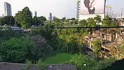 Construction was suspended due to a lawsuit filed by a homeowners' association from nearby upscale Greenhills East Village. As of September 14, 2005, the Philippine Court of Appeals promulgated a resolution allowing the developers to resume construction of the skyscraper.[1] As of 2008, no construction work had proceeded on the excavation area, which is the only completed phase of the project. In 2010, the second division of the Philippine Supreme Court rejected the challenges of the Greenhills East Association, and the developer said that the project (now described as a 77-story building with 8 basements) would proceed.[2][3]