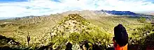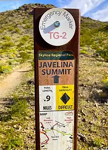 It opened in 2016 with seven miles of trails, which have expanded to over 20 miles with a of mix of hiking,[3] biking[4] and equestrian trails.[5] The most popular trail is the four mile Turnbuckle Loop Trail.[3][6] The Crest Mountain summit vista offers unobstructed views of the Sierra Estrella Mountains to the northeast, Gila Bend Mountains in the southwest and the Big Horn Mountains Wilderness and the Hassayampa Plain in the northwest.[2][7] The Javelina summit offers unobstructed views of downtown Phoenix, the Sierra Estrallas and the extensive desert plains.[8] The Skyline Crest trail contains the highest peak,[9] at 3152 feet, with a key col of 2760 ft.[10] Other amenities include ramadas and shaded picnic and dry camping areas.[11][12] With clear desert nights and remoteness from urban lights, the park is known for its dark skies.[13] Stargazing activities are regularly scheduled; the park hosts "Star Party" events where visitors can learn about the night sky from local astronomers.[14] In 2018 the park added 0.6 miles of accessible trails that can be used by strollers and wheelchairs. Bicycles and horses are not allowed on these trails. These trails have educational interpretive panels about native plants and animals.[15] Guided group hikes are scheduled monthly.[16]