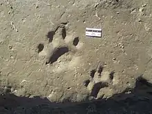 - ↑ Agnolin, F. L.; Chimento, N. R.; Campo, D. H.; Magnussen, M.; Boh, D.; De Cianni, F. (2019). "Large Carnivore Footprints from the Late Pleistocene of Argentina". Ichnos. 26 (2): 119–126. Bibcode:2019Ichno..26..119A. doi:10.1080/10420940.2018.1479962. S2CID 134190731.