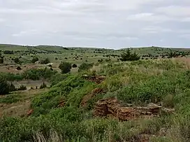 The Dakota Formation forms the eastern region. This area includes the Smoky Hill Buttes,[11] which are capped by sandstone and provide a sharp contrast with the surrounding plains. One of the most notable buttes is Coronado Heights in Saline County.[9] Pawnee Rock was another Dakota Sandstone landmark in the region. There are concretions at Rock City in Ottawa County and Mushroom Rock State Park in Ellsworth County. These are cemented by calcium carbonate.[12]