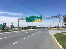 The section of US 13 south of Tybouts Corner serves as part of a primary hurricane evacuation route from coastal areas of the Delmarva Peninsula to inland areas to the north.[5] Portions of US 13 in Delaware are designated as part of the Delaware Byways system. The segments between US 13 Alt. (North State Street) in Dover and Main Street in Smyrna, DE 9 (New Castle Avenue) and A Street in Wilmington, and Swedes Landing Road and DE 9 (4th Street) in Wilmington are part of the Harriet Tubman Underground Railroad Byway.[6] The section of US 13 in Delaware between US 13 Bus. (Philadelphia Pike) and the Pennsylvania state line in Claymont is part of the Washington–Rochambeau Revolutionary Route, a National Historic Trail.[7] US 13 in Delaware has an annual average daily traffic count ranging from a high of 77,363 vehicles at the US 202/DE 141 interchange near New Castle to a low of 4,096 vehicles at the southern border of Wilmington.[1] US 13 in Delaware is a part of the National Highway System between the Maryland state line in Delmar and the Puncheon Run Connector freeway in Dover, from DE 1 in Wrangle Hill to I-495 in Minquadale, and between DE 92 and the Pennsylvania state line in Claymont.[8] US 13 in Delaware is designated as a Blue Star Memorial Highway honoring those who have served in the United States Armed Forces; Blue Star Memorial Highway markers are located at the Smyrna Rest Area and in Seaford.[9] The route was designated as a Blue Star Memorial Highway between the Maryland state line and Dover in 1981 and between Dover and the Pennsylvania state line in 1998.[10]