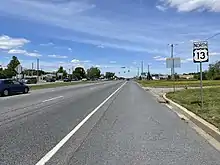 In 1950, recommendations were made by the chief engineer of the DSHD to widen US 13 into a divided highway between Delmar and Dover.[49] The divided highway was completed from Hearne's Mill north to just south of Greenwood in 1952. The highway bypassed Bridgeville to the east, rerouting US 13 off Main Street in that town.[50][51] In 1953, the divided highway portion of US 13 was built around Seaford.[52] The divided highway was completed between the Maryland border in Delmar and Hearne's Mill and from Harrington to Dover in 1954.[53][54][55] The new alignment of US 13 between Delmar and Hearne's Mill was built further to the east, with the former two-lane alignment running through Delmar, Laurel, Blades, and Seaford becoming US 13 Alt. The bypassed two-lane alignment between Canterbury and Camden was also designated as US 13 Alt.[55] In 1956, work was underway in widening US 13 into a divided highway between south of Greenwood and Harrington.[56] The widening of this portion of US 13 was finished in 1957, completing widening US 13 to a divided highway between Delmar and Wilmington.[41] By 1957, the former alignment of US 13 in Bridgeville along Main Street was designated US 13 Alt. (now US 13 Bus.) while US 13 Alt. between Delmar and Hearne's Mill was decommissioned.[57]
