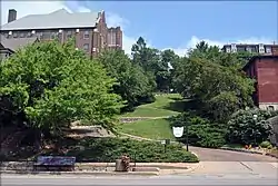 The Snake Alley Historic District is a nationally recognized historic district located in Burlington, Iowa, United States. It was listed on the National Register of Historic Places in 1975, and it was included in the Heritage Hill Historic District that surrounds it, in 1982. The historic district is largely a residential area that includes ten contributing properties.[2] It is centered on Snake Alley, a 275-foot (84 m) brick roadway built in 1894 that rises 58.3 feet (18 m) from Washington Street to Columbia Street.[2] The alley receives its name from the five half curves and two quarter curves that climb the hill. Cobblestone Alley is the eastern boundary of the district. It is a very steep roadway composed of large, limestone blocks. Six houses, built between 1845 and about 1880, surround Snake Alley. Schwartz' Auto Electric Service building and the First United Church of Christ complex round out the contributing buildings.
