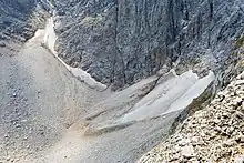 Snezhnika (Bulgarian: Снежника 'the snow patch') is a glacieret in the Pirin Mountains of Bulgaria, a remnant of the former Vihren Glacier.[1][2] The glacieret lies at an elevation between 2,425 m (7,956 ft) and 2,480 m (8,140 ft)[3][4] in the deep Golemiya Kazan cirque at the steep northern foot of Vihren (2,914 m (9,560 ft)), Pirin's highest summit.[5][6] Due to the relatively easy access and its location along a popular hiking trail, Snezhnika is Bulgaria's most famous glacieret.[7] Snezhnika has an average area of 0.01 km2 (0.0039 sq mi)[2] and in 2006 it had a volume of 30,000 m3 (1,100,000 cu ft).[8]
