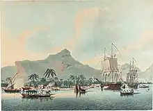 HMS Resolution and Discovery in Huahine, commanded by James Cook, depicted by John Cleveley. National Maritime Museum, Greenwich.